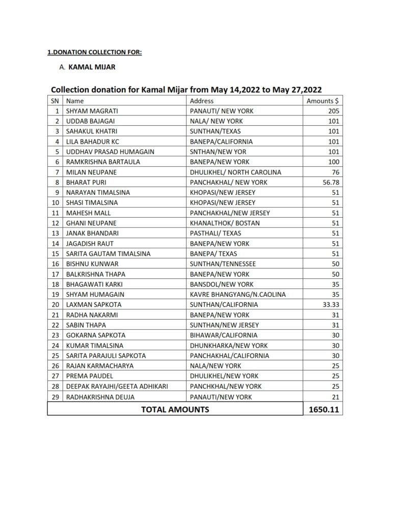On one side, his aged parents, wife, and daughter were suffering, while on the other side, the energetic son, husband, and father of the family was on the brink of death. In response to Kamal Mizar’s request, this organization collected $1,650 as requested by the US-based Kavreli family. The team went to his residence to hand over NRS. 2,05,000/- on Jeshta 21st, 2079 (June 4, 2022, Saturday), it was handed over to Mr. Kamal Mizar in the presence of the President and Secretary of the organization.