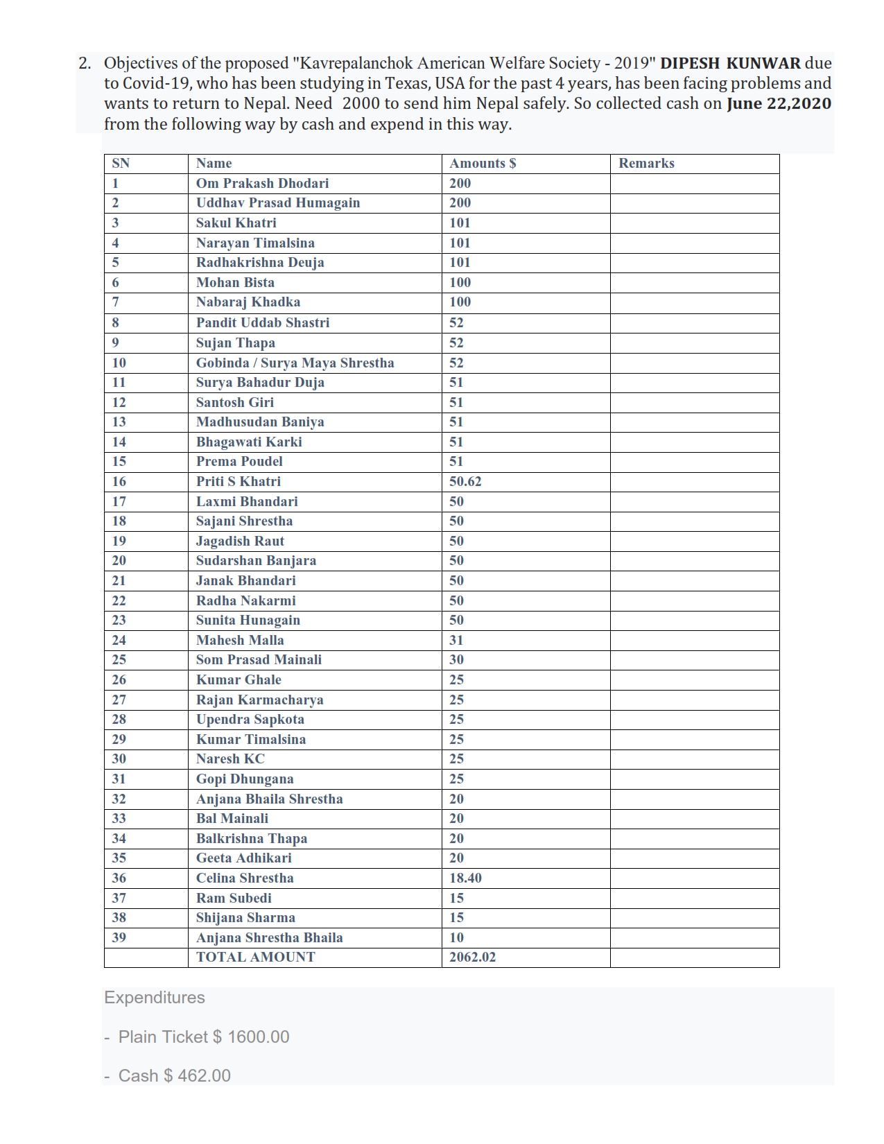 Despite the challenges, Dipesh found solace in the unwavering support of his friends and the Kavrepalanchok American Welfare Society. In June 2020, recognizing his dire financial situation, the Society rallied the Nepalese community, especially those from Kavrepalanchok, residing in the USA, to raise funds. Through collective efforts, $2062.02 was gathered, enabling Dipesh to return to Nepal safely.