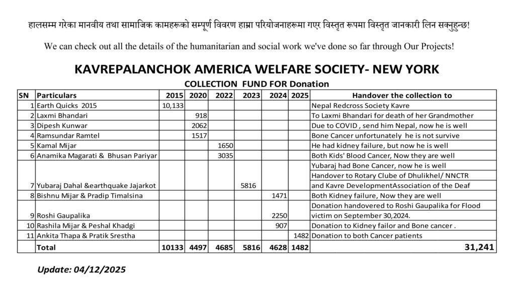 With the active support and participation of Kavreli families who have migrated from Kavrepalanchok district to various states across the United States, the ‘Kavrepalanchok America Welfare Society,’ officially registered and operating in the state of New York, has been conducting various social and humanitarian assistance programs in the Kavrepalanchok district since 2015. We would like to inform you all that these support initiatives have been made possible through contributions collected from Kavreli families.
