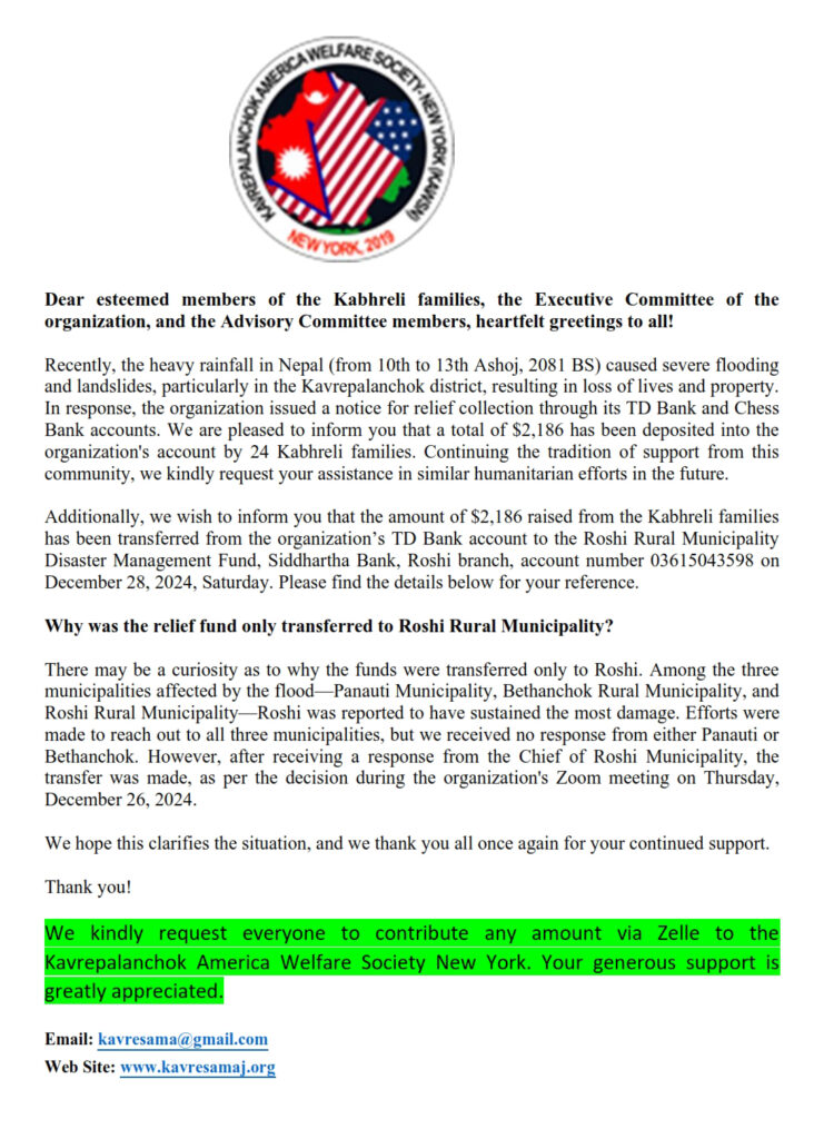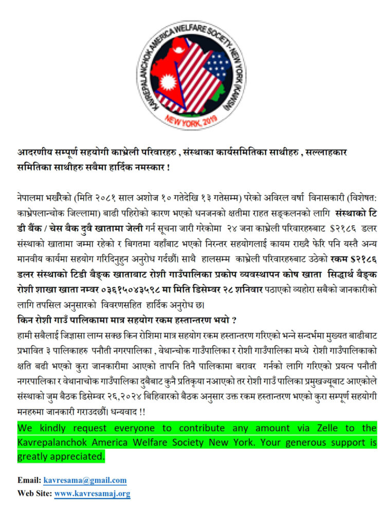 We kindly request everyone to contribute any amount via Zelle to the Kavrepalanchok America Welfare Society New York. Your generous support is greatly appreciated.