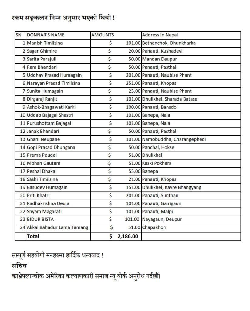 We are pleased to inform you that a total of $2,186 has been deposited into the organization’s account by 24 Kabhreli families. Continuing this tradition of support, we kindly request your assistance in similar humanitarian efforts in the future.