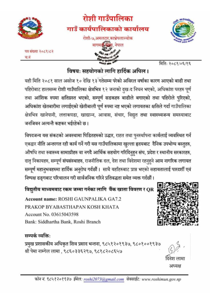Some may wonder why the funds were transferred solely to Roshi Rural Municipality. Among the three municipalities affected by the floods—Panauti Municipality, Bethanchok Rural Municipality, and Roshi Rural Municipality—Roshi was reported to have suffered the most damage.