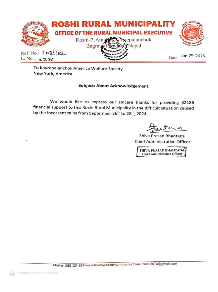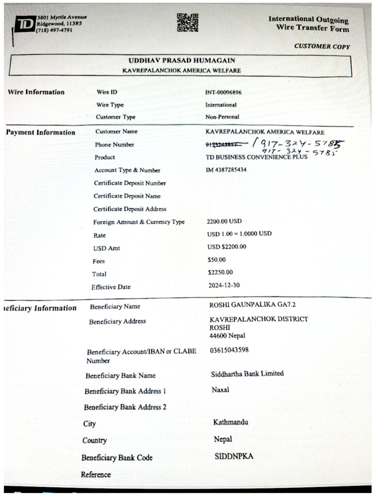Additionally, we wish to inform you that the $2,186 raised from Kabhreli families has been transferred from the organization’s TD Bank account to the Roshi Rural Municipality Disaster Management Fund (Siddhartha Bank, Roshi branch, account number 03615043598) on Saturday, December 28, 2024. Please find the details below for your reference.